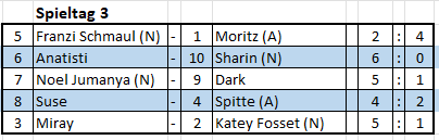 Nach dem kleinen Dämpfer am 2.Spieltag zeigte sich Noel erneut konzentriert und spielsicher. Dark hatte wenig entgegenzusetzen und man kann seine Einstellung dazu nur bewundern. „Es ist ein Spiel, und es ist nicht zu sehr von Bedeutung wie man abschneidet“. Zudem fehlen wohl auch einige Trainingsmöglichkeiten. Also, wenn ihr das hier lest – und Lust habt zu spielen – dann ladet doch Dark mal zu euch ein. Endstand 5:1