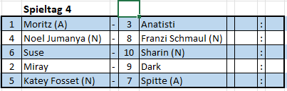 Nach der einsetzenden Schnappatmung kam Miray dann aber immer besser ins Spiel. Ich habe noch nie eine Spielerin gesehen die gleich 4-5 mal vergisst den Sack zuzumachen – immer wieder übersieht Katey eindeutigste Möglichkeiten das Spiel für sich zu entscheiden. Miray gewinnt daher viel zu deutlich 5:1 und hat sicher eine ganze Portion Glück mit gepachtet. Wird sie nicht groß jucken…sie hat ihren 3er und gilt somit nun als die Verfolgerin für Moritz.
